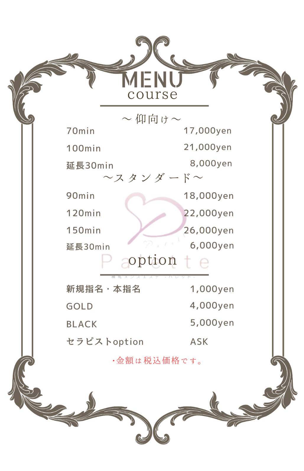 ※specialセラピスト・newfaceセラピストは仰向けコースは70min・スタンダードコースは90minのみの対応となりご予約時点でのご延長はお断りしております